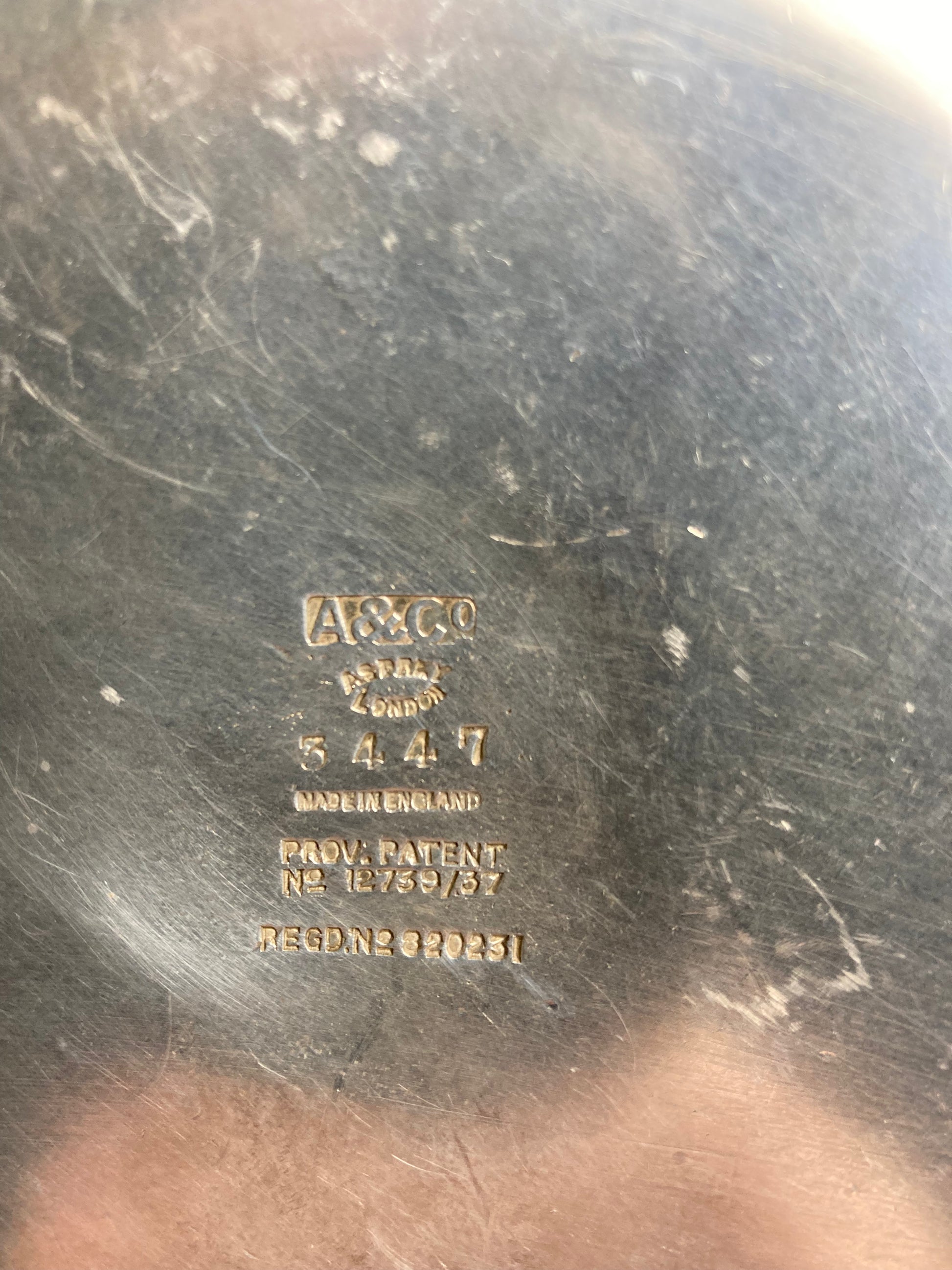 Stamped A & Co, Asprey London, no. 3447, Made in England, Prov Patent No. 12739/37, and Regal no. 820231 (see photos of markings)