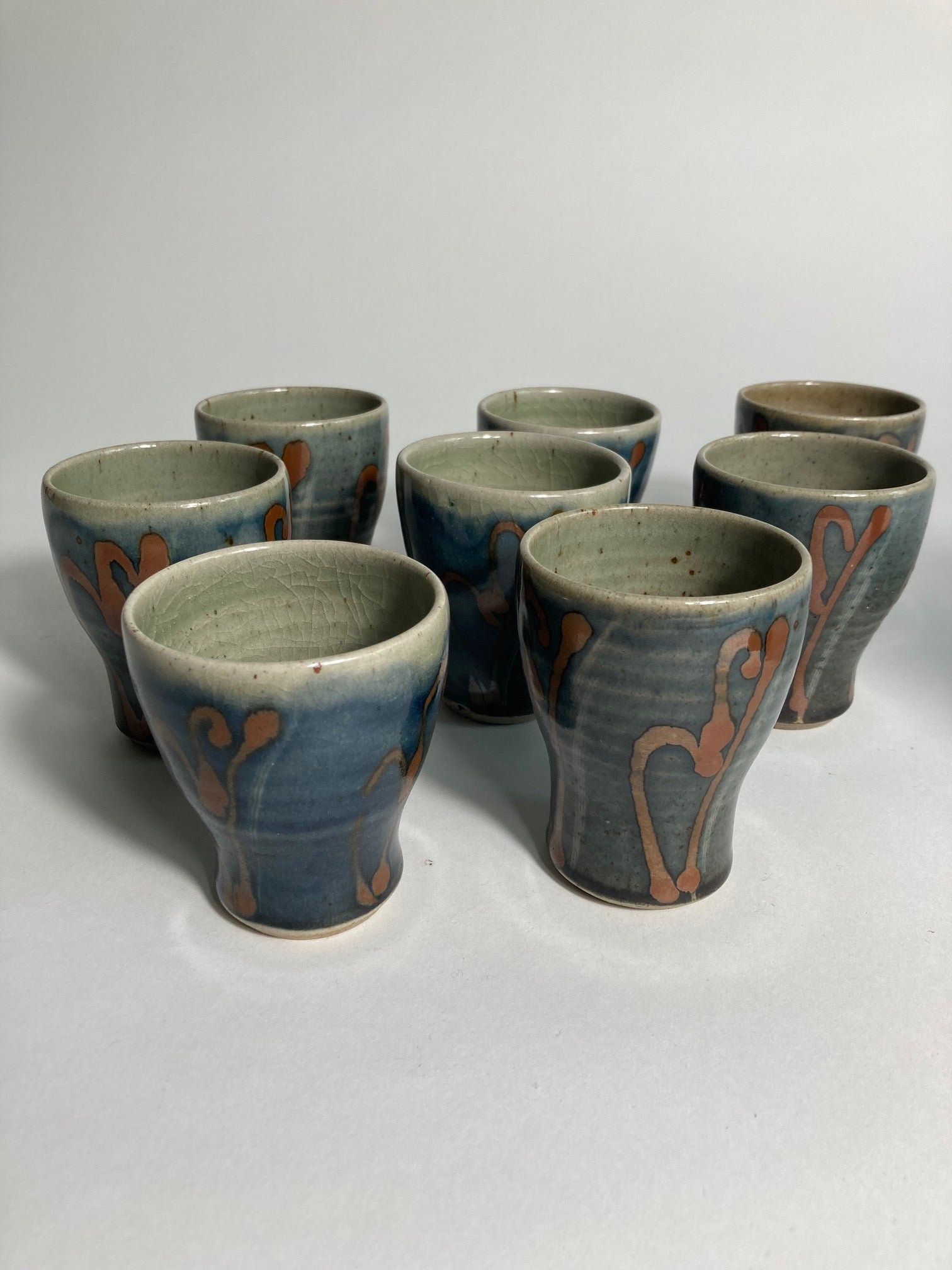 This set of studio pottery by acclaimed British potter David Frith features a generously proportioned lemonade jug accompanied by nine matching tumblers. The tallest piece, the jug, stands at 20cm in height. Each piece displays Frith’s signature craftsmanship, with balanced forms and rich, earthy glazes that reflect his deep connection to traditional and contemporary ceramic techniques.