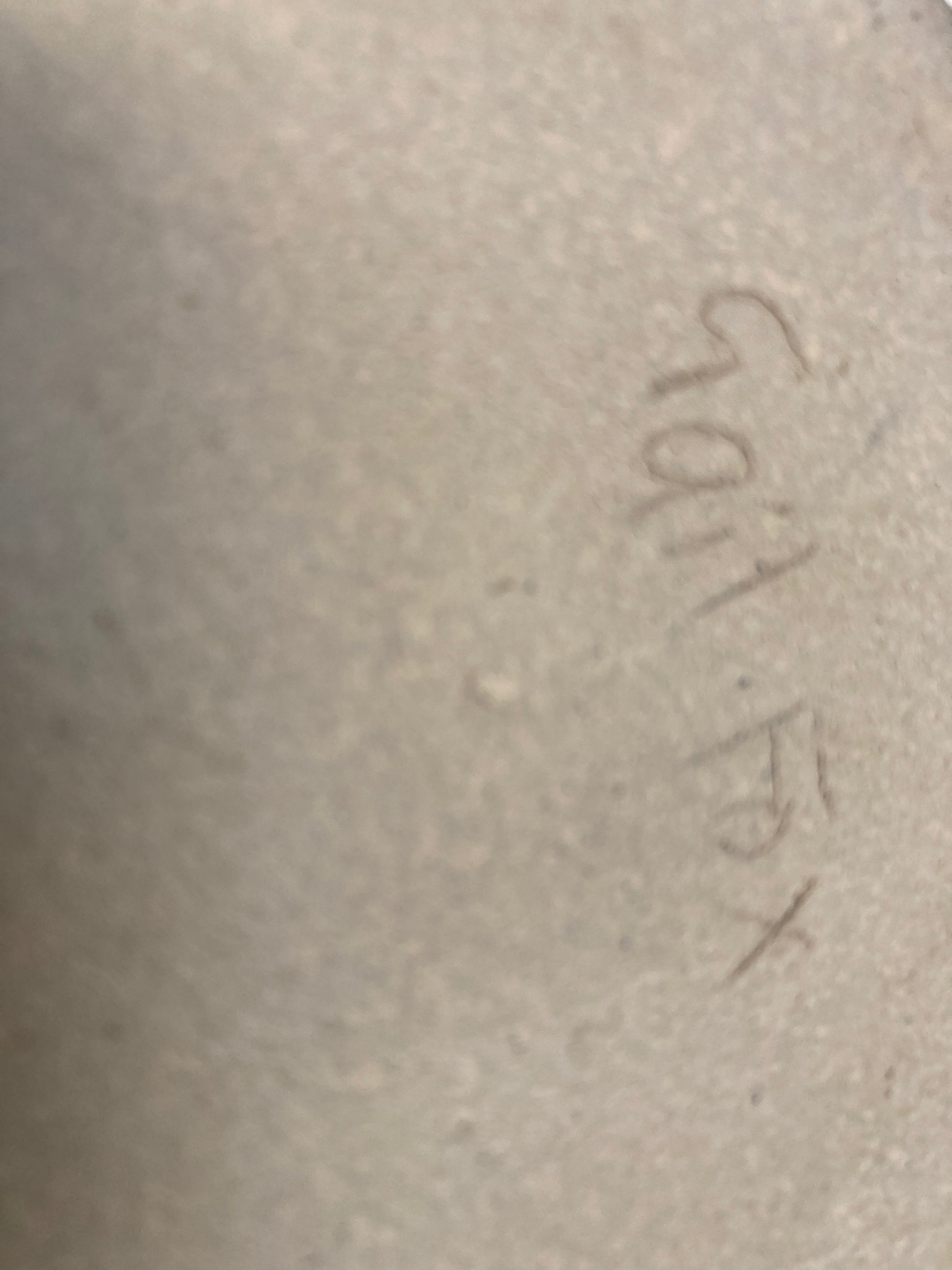 Large Earthenware Amphora with side handles by Gail Fox (B 1955) covered in a mottled pale green glaze and signature incised. Gail Fox studied at Central St Martins and went on to become a successful ceramics artist and also a 2D collage Artist. Her work can be found in collections internationally.