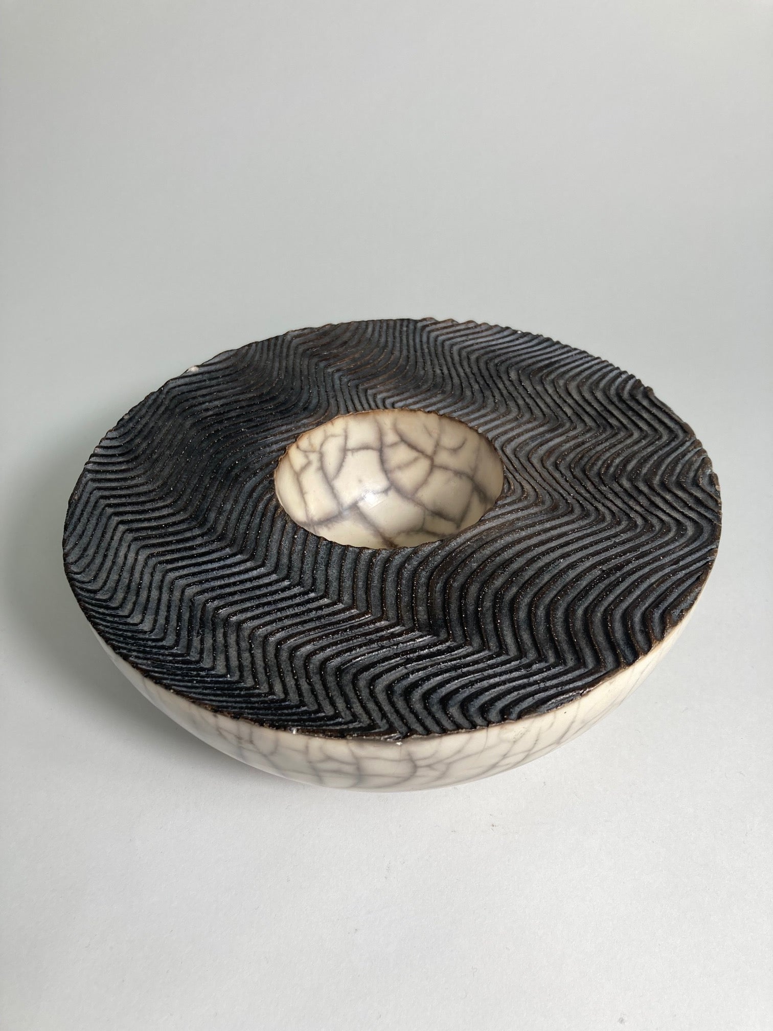 Raku Fired Bowl – Semi-hemispherical form with central indent, raku-fired for a unique crackle glaze effect, impressed mark to base. Dimensions: D 23cm x H 10cm.