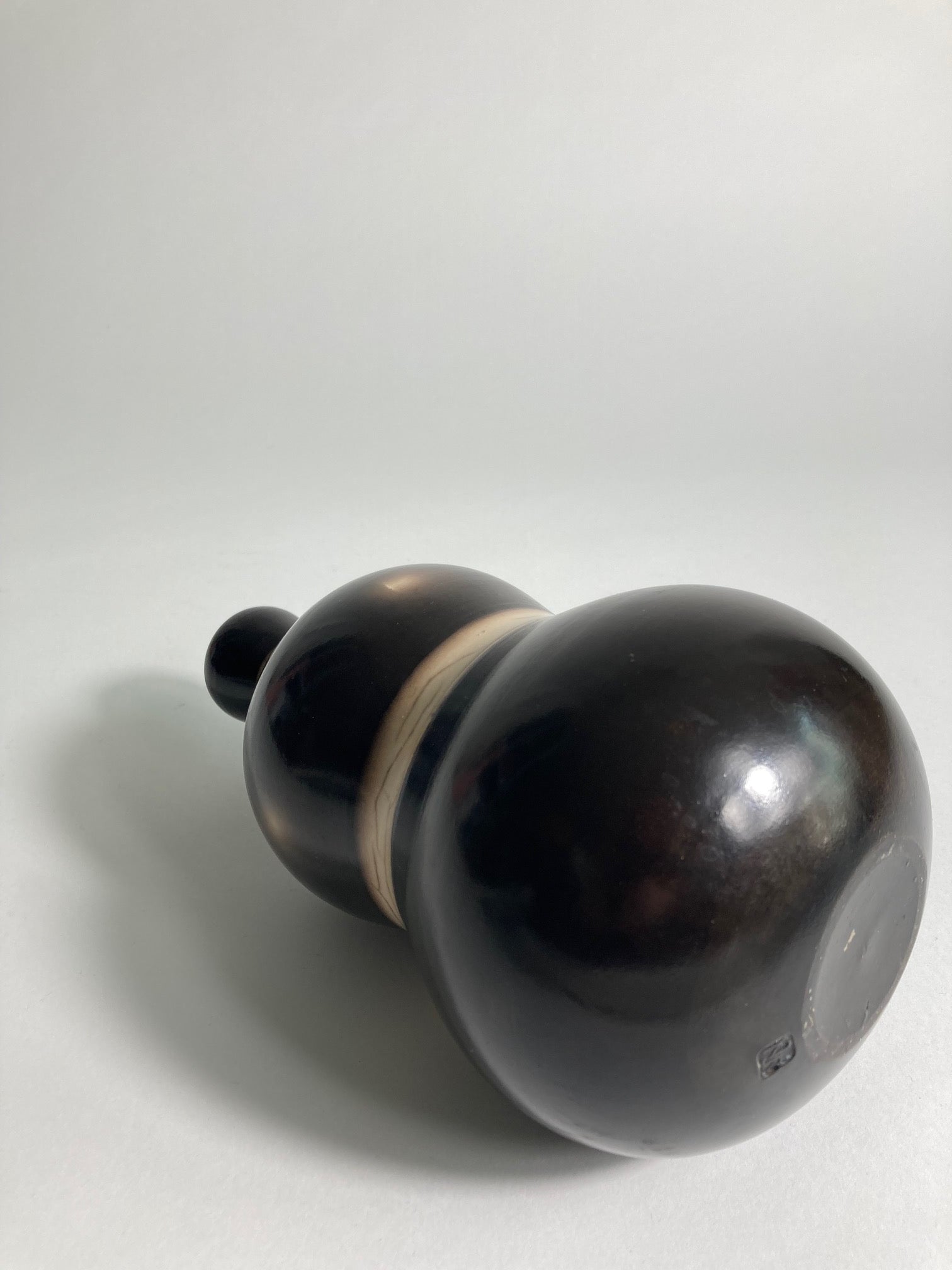 - Double-Gourd Vase – Raku Fired Elegant sculptural form decorated with horizontal bands of white glaze, marked to base. Height: 24cm.
