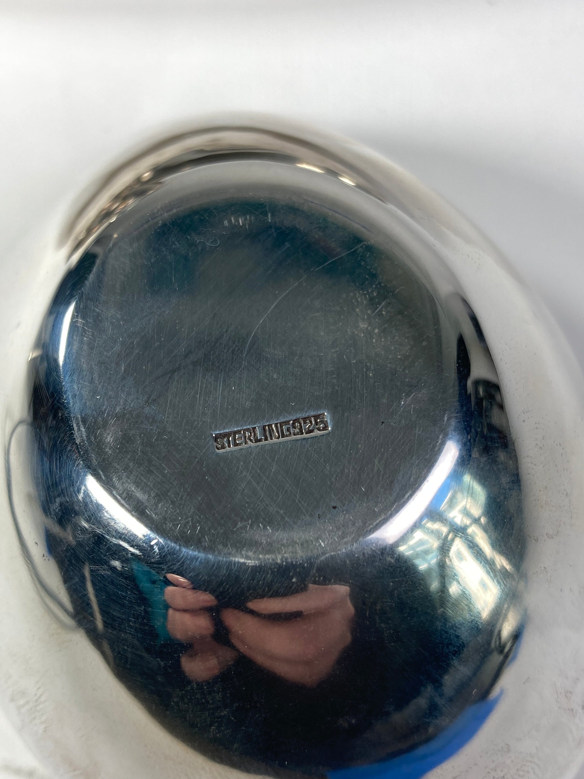 Condiment set consisting of a milk jug, sugar bowl and spoon resting on a serving tray. All pieces stamped STERLING 925